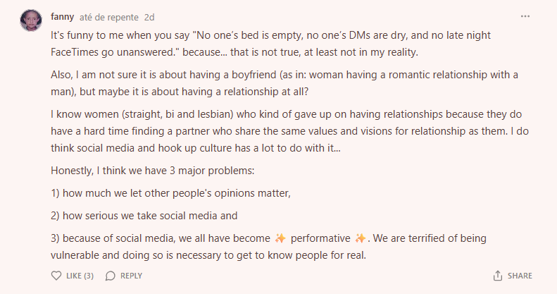 Conheço uma pá de mulheres cuja cama está vazia, sim. Eu, inclusive, sou uma delas. E um ponto curioso: nem todas nós somos mulheres heterossexuais. Conheço bissexuais e lésbicas que estão com as DMs cheias de pó. Na minha experiência (e na de algumas dessas mulheres também), está difícil criar laços e conhecer pessoas que compartilham dos mesmos valores que os nossos. Minha suspeita é que essa dificuldade tem uma relação direta com como temos (re)tratado a vida nas redes sociais, o que acaba refletindo em como estamos (re)tratando a vida como um todo — porque, afinal, a vida nas redes sociais é parte da vida como um todo; se é uma parte grande ou pequena, aí é com cada usuário.
