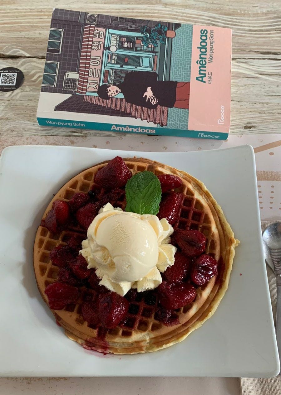 Comecei a leitura na piscina do hotel, enquanto pegava um sol. Entrei na piscina com ele mais de uma vez e nenhum acidente aconteceu. No dia seguinte, levei o livro comigo para a Crepes & Waffles. Juntos, comemos um belo waffle com calda de frutas do bosque e uma bola de sorvete generosa, sabor creme, meu preferido.